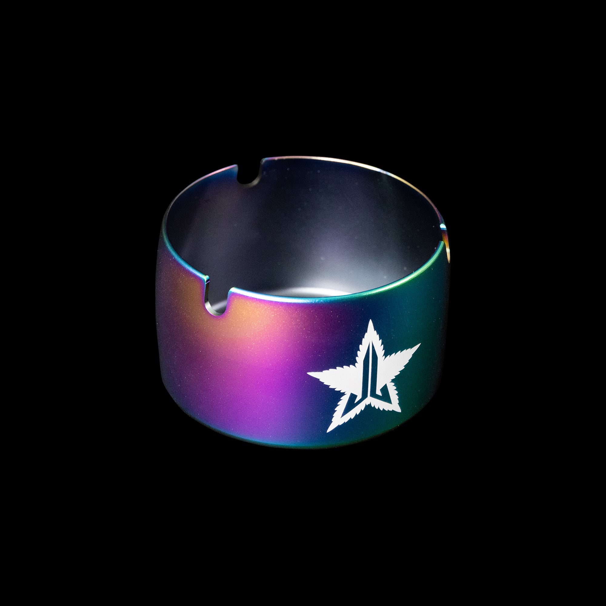 Aluminum ashtray with three resting slots in a premium oxidized finish with laser logo detail. Approximate size 62mm.